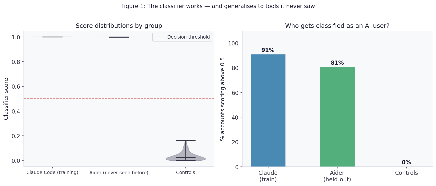 This cross-tool generalisation is the key validity result: the classifier detects general AI-assisted coding behaviour, not Claude-specific stylistic artefacts. The independent variable in the causal analysis is therefore interpretable as a measure of AI-assisted coding broadly.