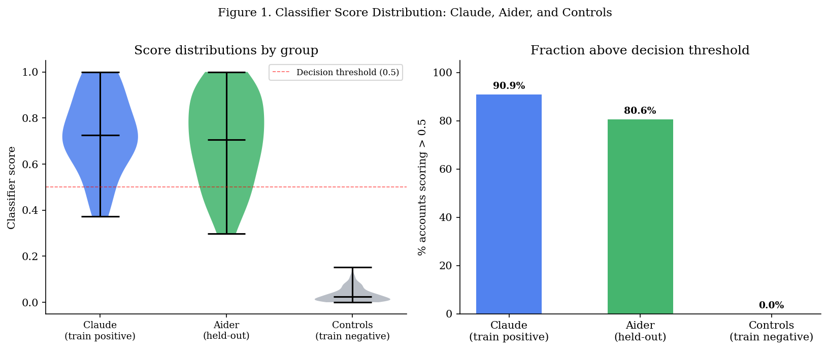 The classifier, trained exclusively on Claude Code ground truth, assigns scores of 0.727 (mean) to Aider users — statistically indistinguishable from the Claude training positives (Mann-Whitney p = 0.065) and far above negative controls (p < 0.0001). 80.6% of Aider accounts score above the 0.5 decision threshold vs 90.9% of Claude positives and 0% of controls.