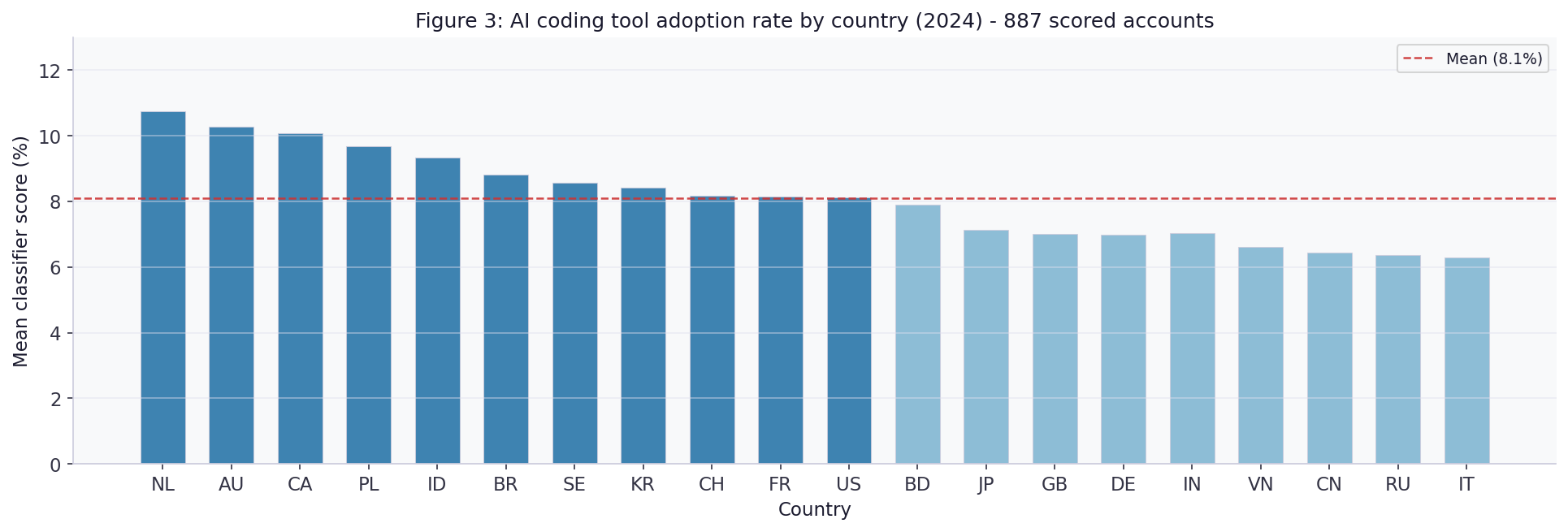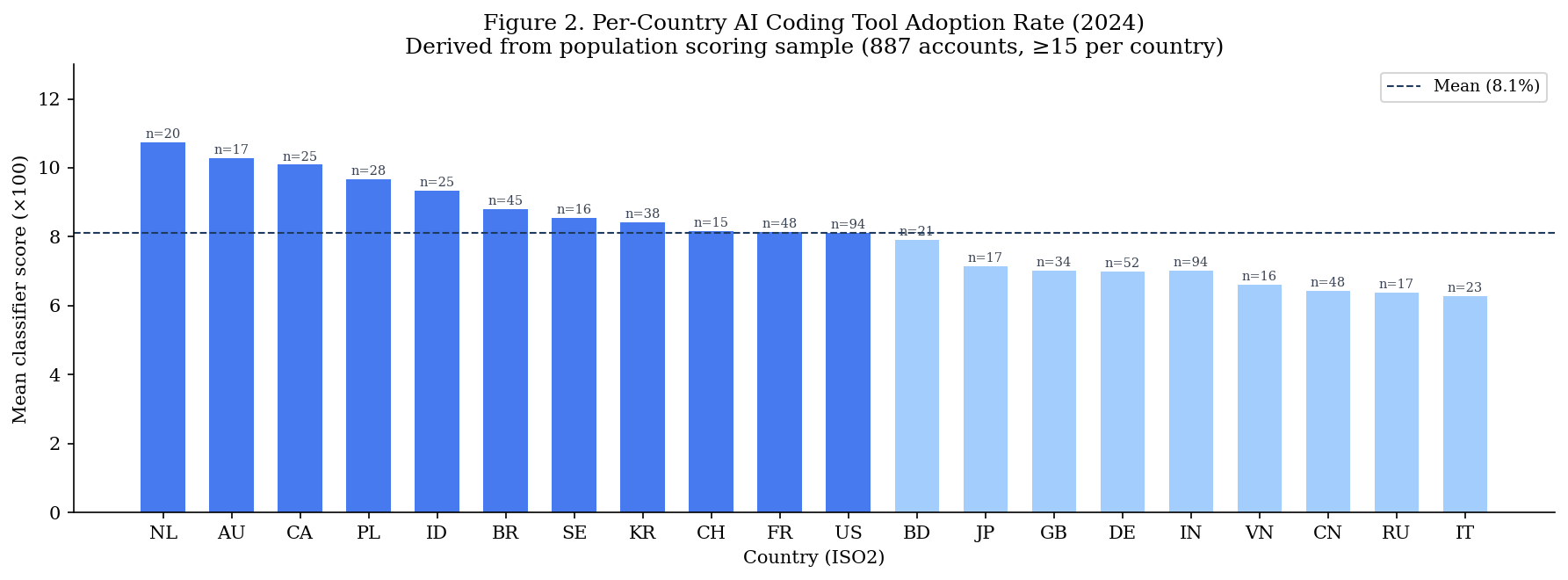 Mean classifier-derived adoption rates range from 6.3% (Italy) to 10.7% (Netherlands), with a cross-country standard deviation of 1.4 percentage points. English-speaking and northern European countries show the highest adoption rates; East Asian and southern European countries the lowest. The narrow cross-country range (4.4 pp) is a key limitation of the country-level analysis.