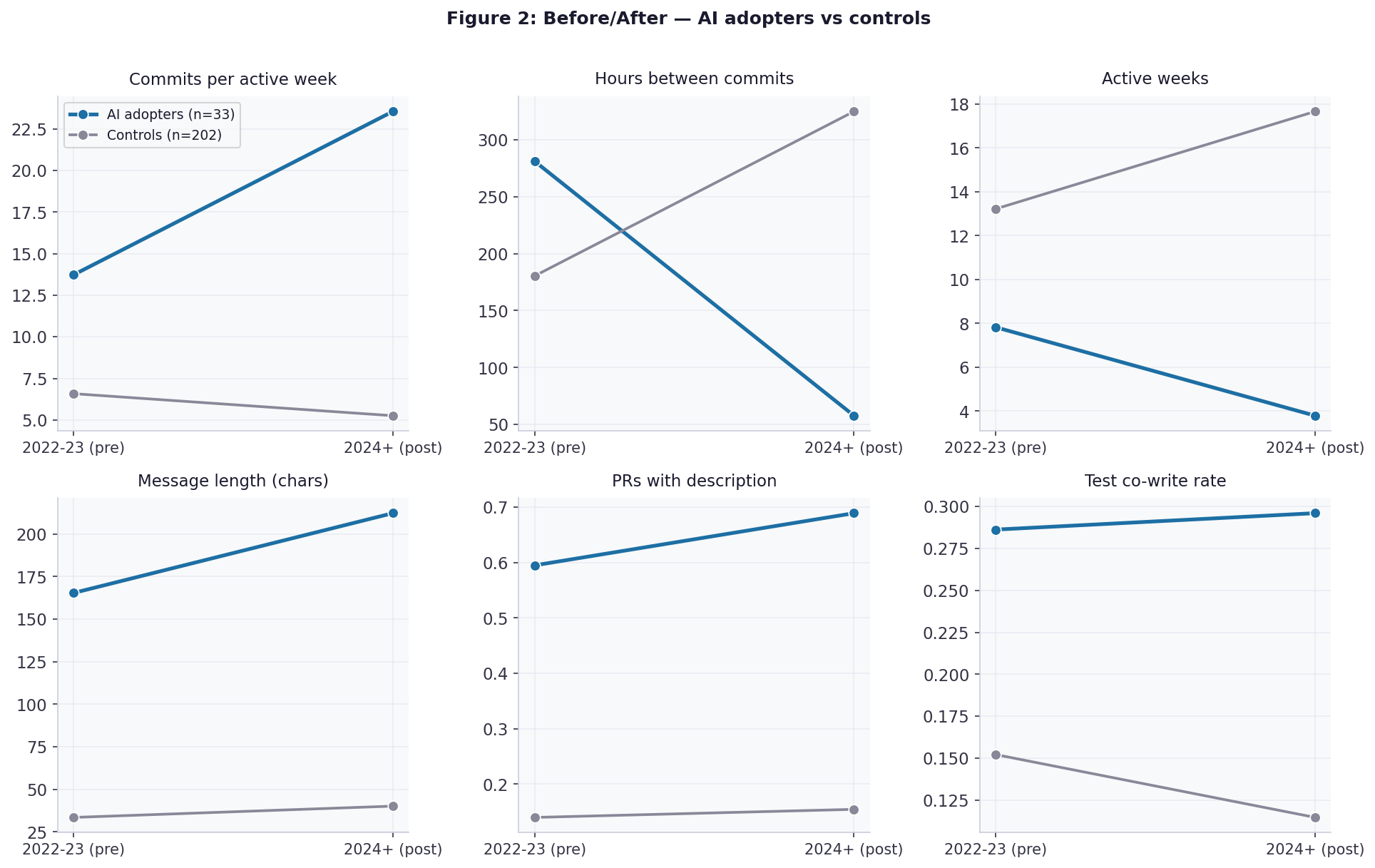 Commits per active week increases by 13.1 (p < 0.001) and inter-commit hours decreases by 275 (p < 0.001). The combination of fewer active weeks (−11.3, p < 0.001) with higher commit intensity per session is consistent with AI assistance concentrating productive output into shorter, more intense coding sessions.