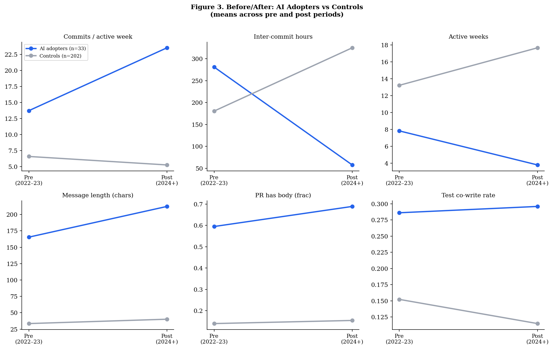 Second, we use the classifier in two causal designs. An account-level difference-in-differences on 235 accounts (33 confirmed adopters, 202 controls) finds large, statistically significant effects: AI adopters increase commits per active week by 13.1 (p < 0.001) and reduce inter-commit hours by 275 (p < 0.001) relative to controls, consistent with AI assistance reducing friction in the development loop. A country-level panel regression across 20 countries (2022–2024) finds no significant effect (coef = −4.91, SE = 6.13, p = 0.43), a null result we attribute primarily to measurement noise in country-level productivity aggregates rather than the absence of an underlying effect.