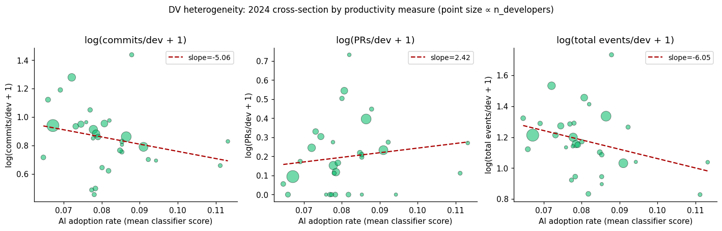 The single most informative robustness check is the dependent variable. Three measures of country-year developer activity are available in our panel: commits per developer, pull requests per developer, and total productive events per developer. Under any account of AI adoption that affects developer productivity, all three should move in the same direction. They do not.