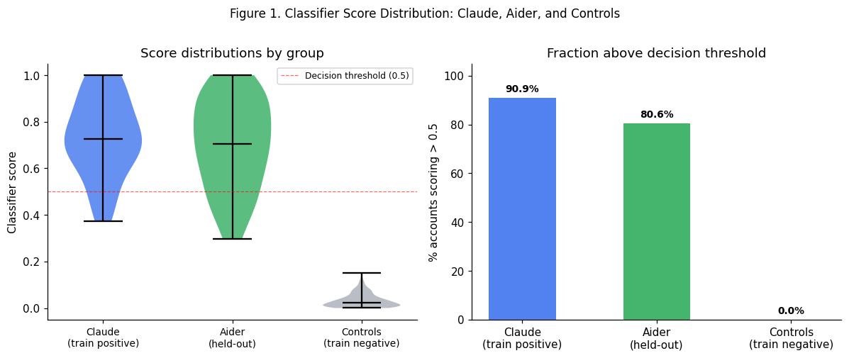 The classifier, trained exclusively on Claude Code ground truth, assigns scores of 0.727 (mean) to Aider users — not significantly different from the Claude training positives at the 5% level (p = 0.065) and far above the negative controls (p < 0.0001). 80.6% of Aider accounts score above the 0.5 decision threshold, compared to 90.9% of Claude positives and 0% of controls.