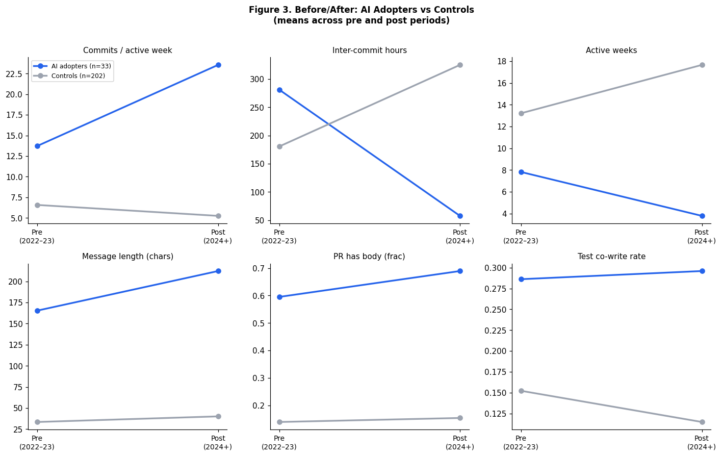 - The account-level result includes both increased commits per active week and increased message length. Within a confirmed adopter’s own behaviour, these shifts coexist.