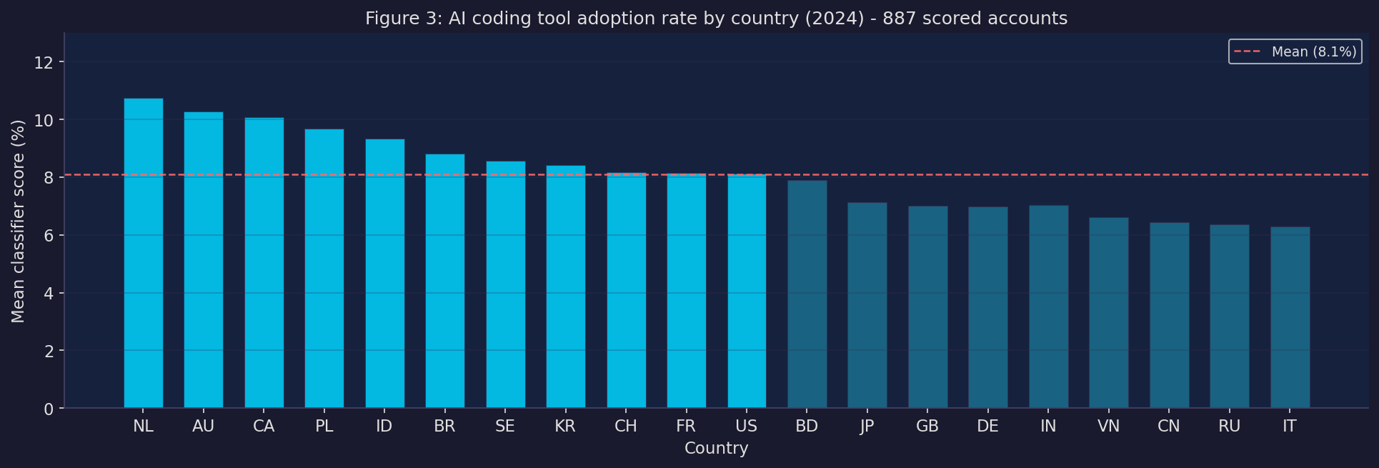 A future study with a larger panel (sampling 2,000–5,000 developers per country per quarter rather than 500) and a longer time horizon would have a much better chance of answering this question definitively.