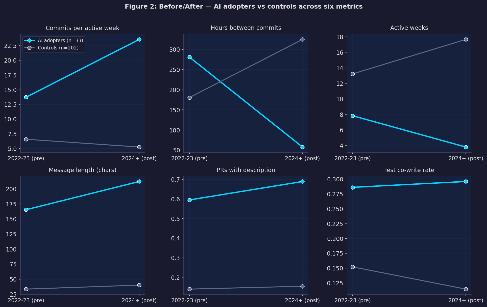 AI adopters commit much more frequently when they’re active. Hours between commits drops from 281 to 58 — roughly a 5× increase in commit velocity during coding sessions. Controls go the opposite direction, from 180 to 325 hours.