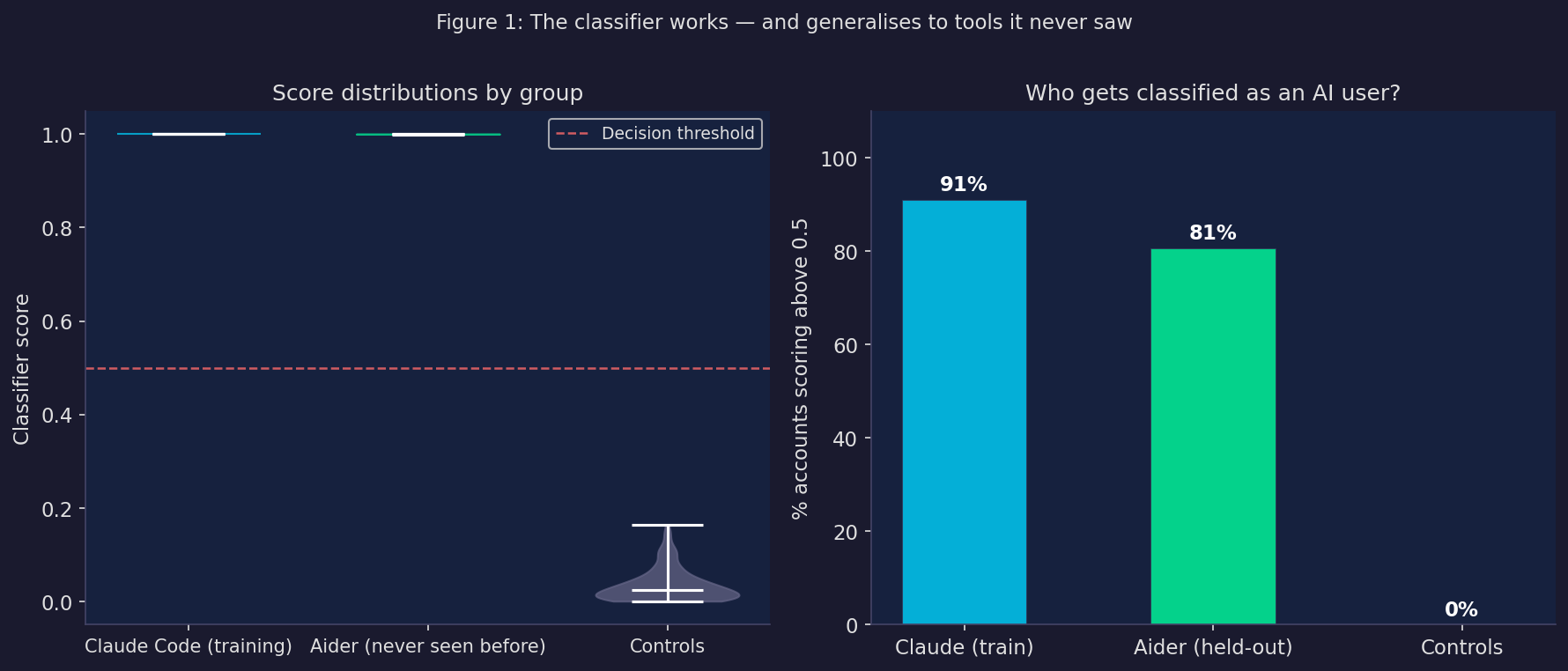 But the more interesting result is what happens when you apply it to Aider users — a completely different AI coding tool that the classifier was never trained on. Aider accounts score an average of 0.727, compared to 0.776 for Claude users and 0.033 for controls. 80% of Aider users score above the decision threshold, compared to 91% of Claude users and 0% of controls.